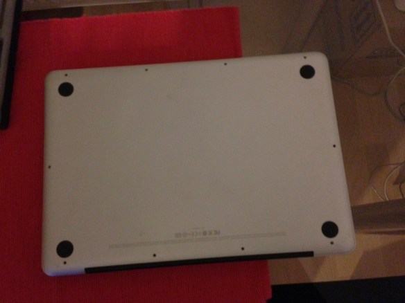 Sobald das Macbook abgekühlt ist dreht man das Gerät mit dem Display nach unten. So kommt man an die Unterseite, wo 10 Schrauben den Unterboden an dem Gehäuse halten.