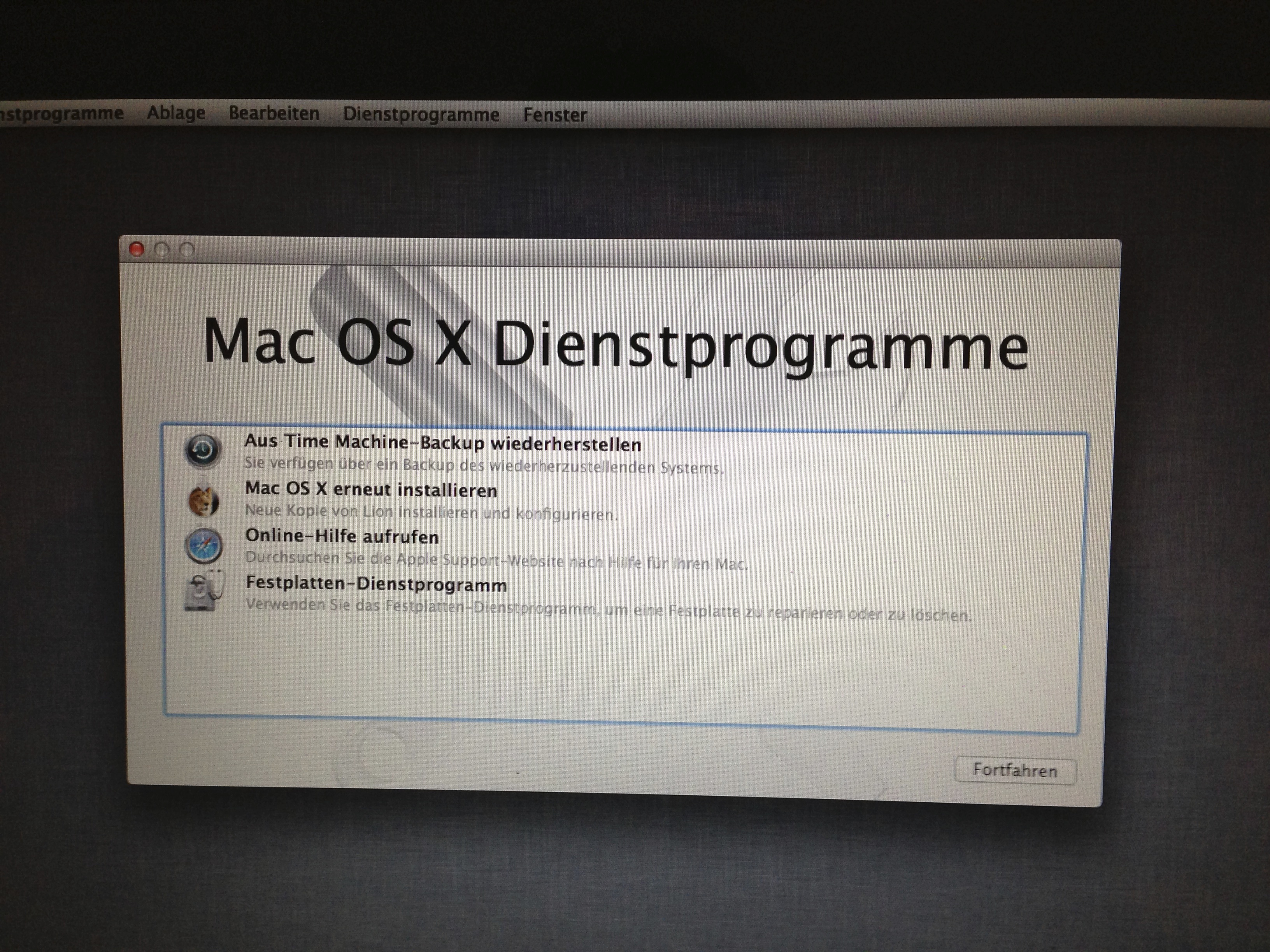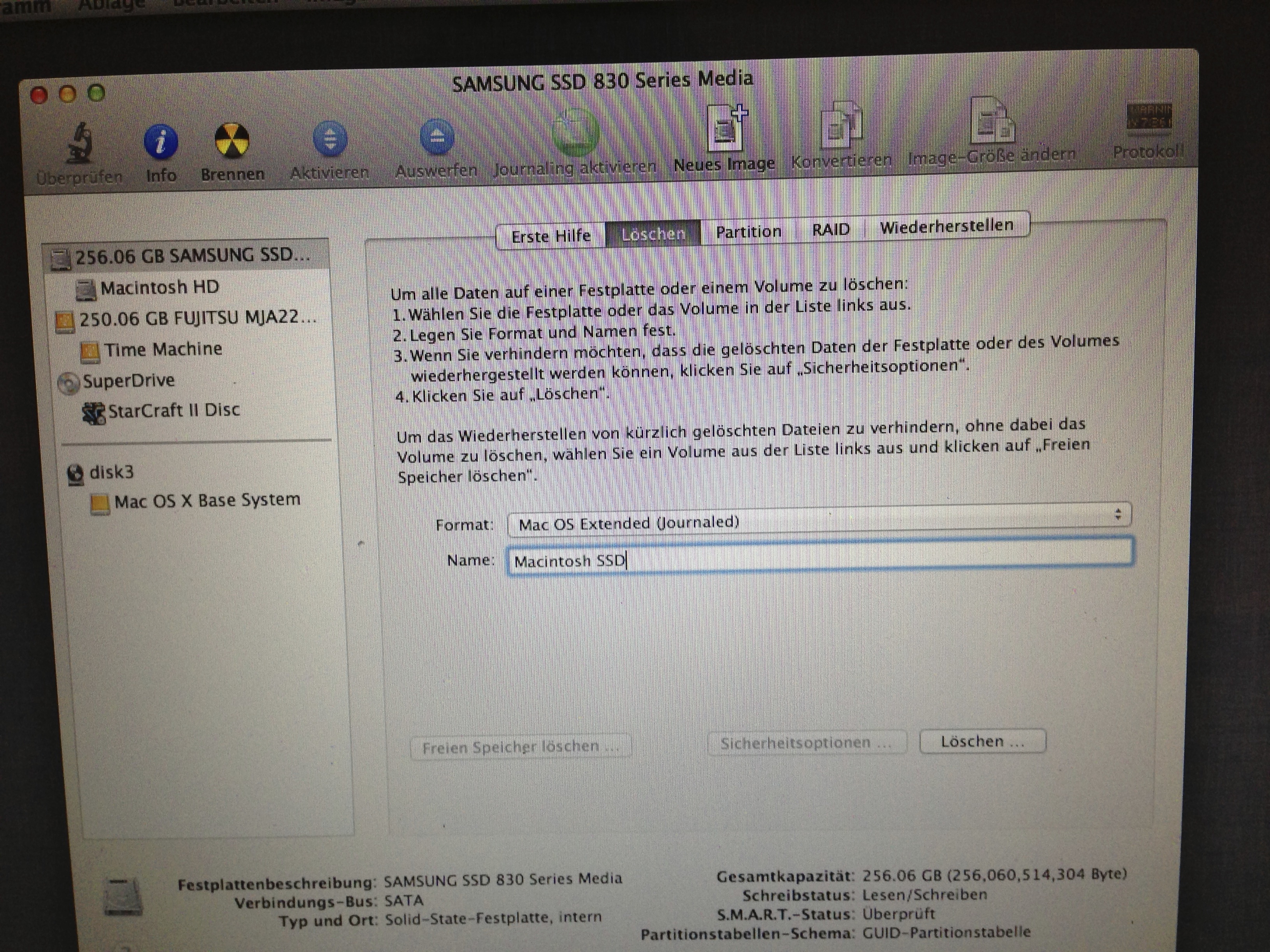 Klickt hierzu auf „Festplatten-Dienstprogramm“. Wählt im nächsten Fenster zuerst den Reiter „Löschen“, wählt dann „Mac OS Extended (Journaled)“ aus und gebt der Festplatte einen Namen.