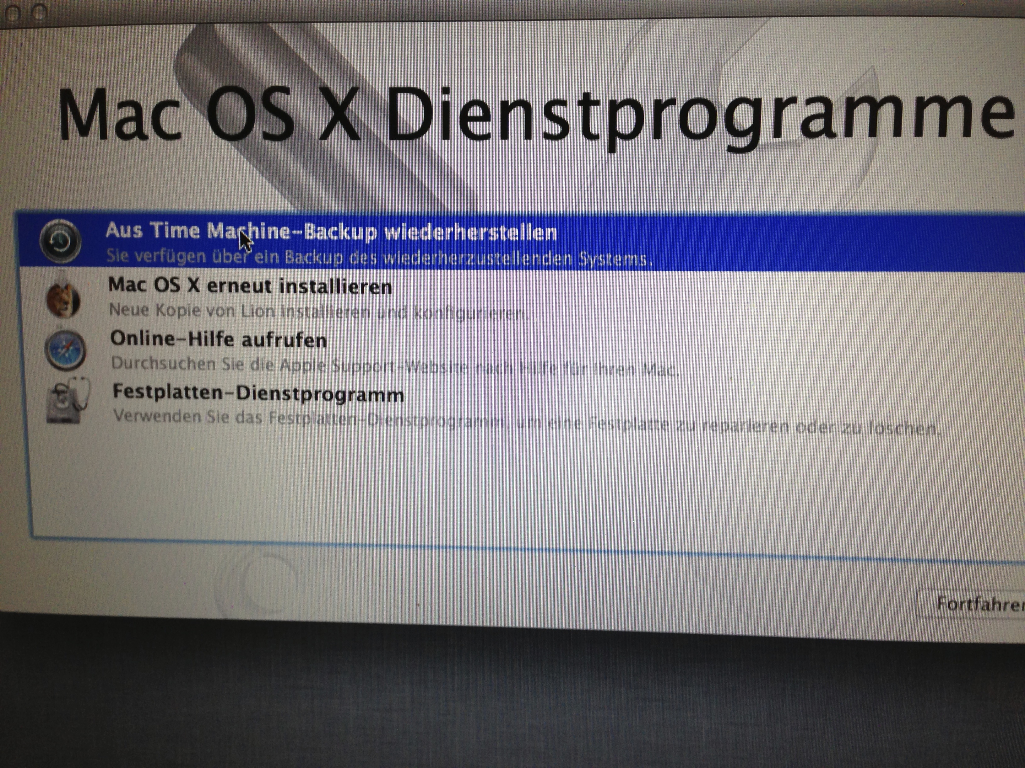 Schließt nun die externe Festplatte mit dem Time Machine Backup an und klickt auf „Aus Time Machine- Backup wiederherstellen“.