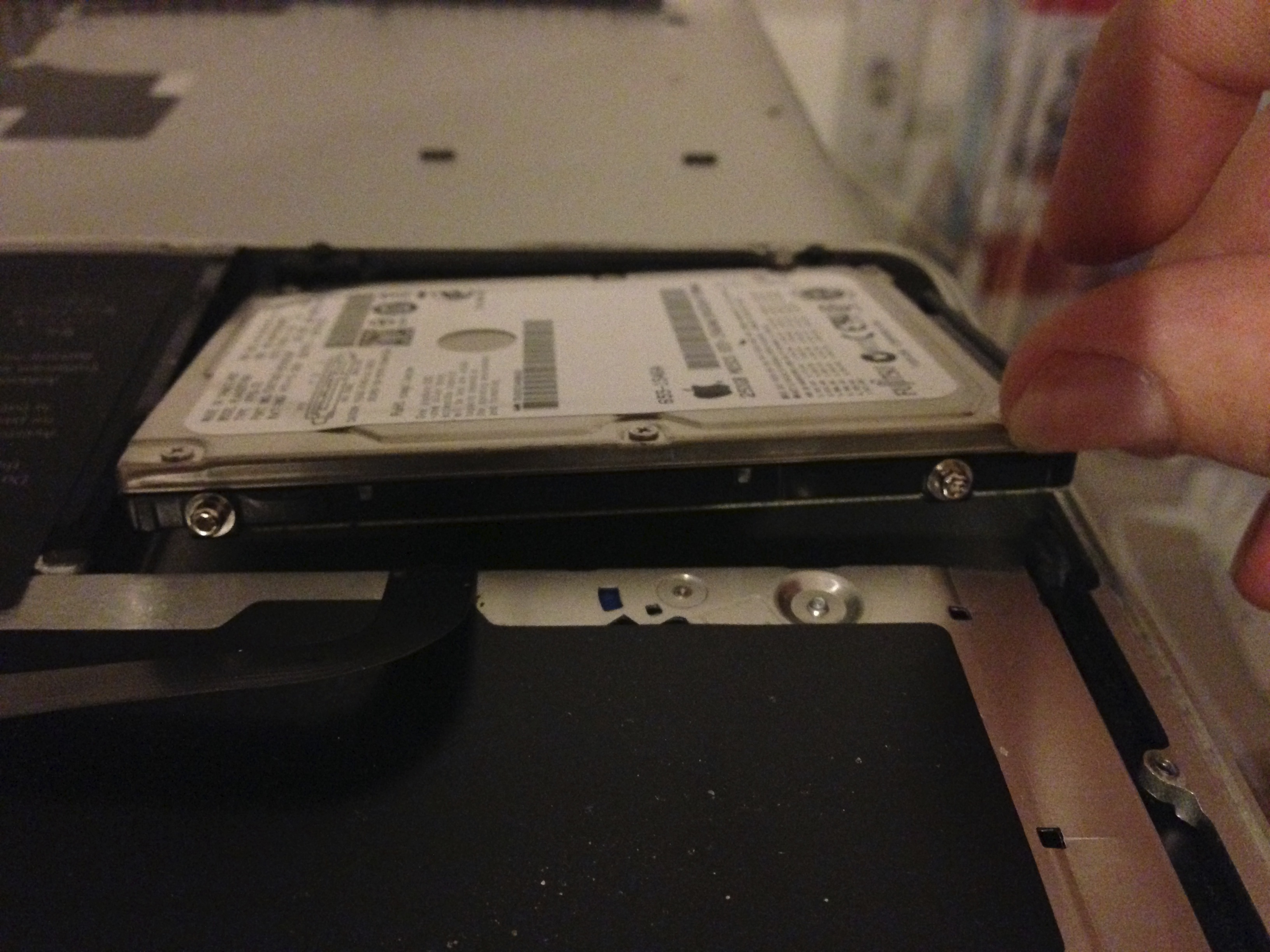 Darüber liegt die Festplatte, welche ebenfalls silbern, aber deutlich kleiner ist. Die Festplatte wird von 4 schwarzen Schrauben gehalten. Diese müssen wir lösen.