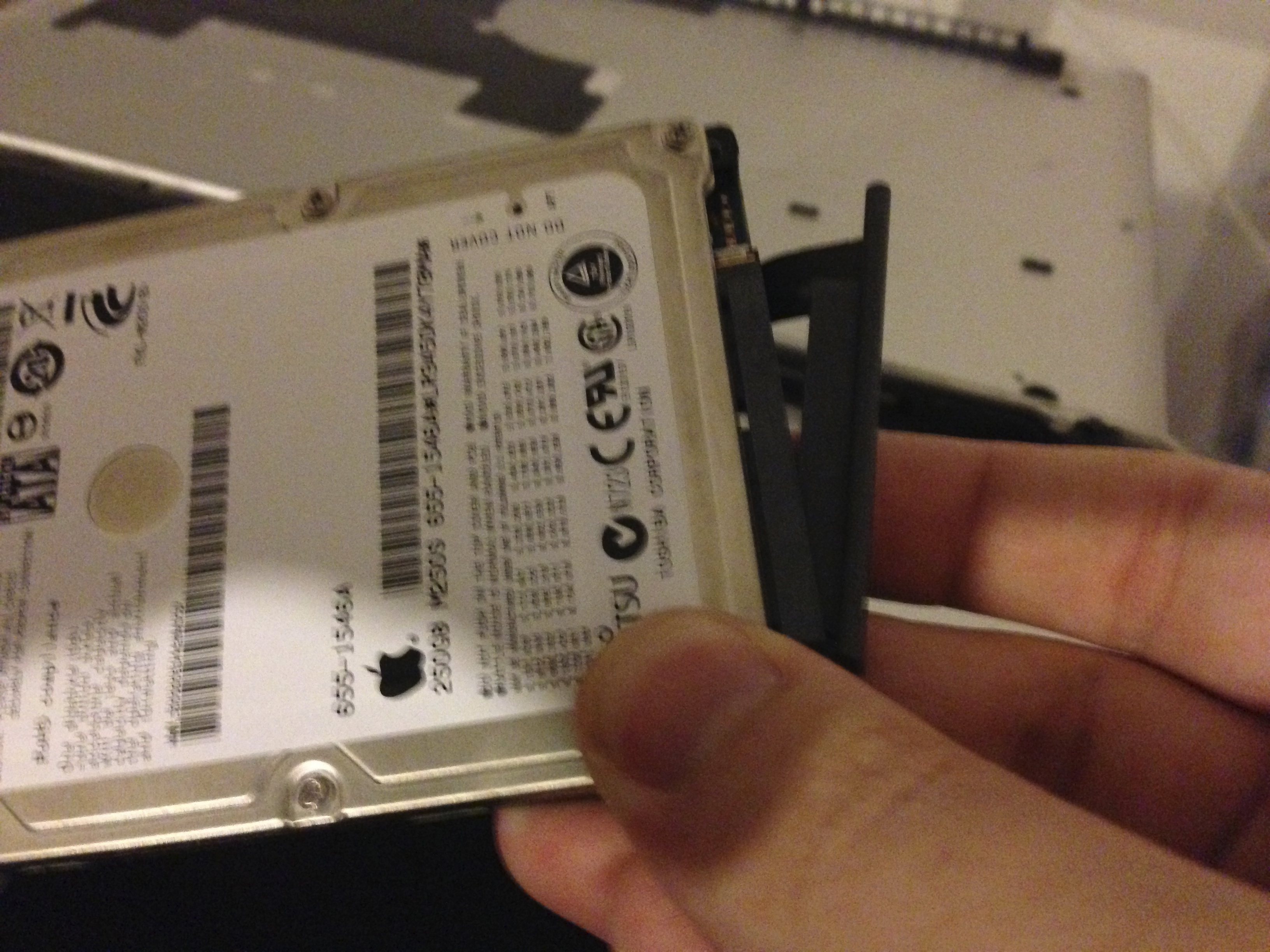 Nun könnt ihr die Halterungen der Festplatte, welche euch am nächsten ist herausnehmen. Danach könnt ihr die Festplatte vorsichtig mit der euch zugekehrten Seite anheben. Vergesst bitte nicht, dass die Festplatte noch mit einem Kabel verbunden ist, welches ihr auf keinen Fall abreißen dürft.