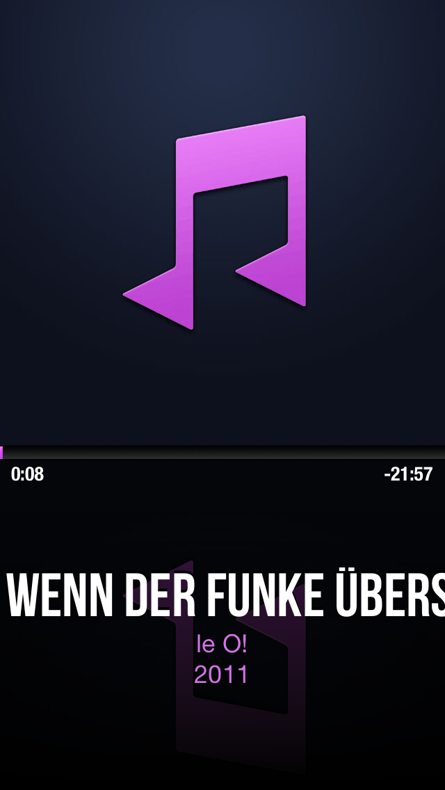 Die weiße Schrift setzt sich natürlich sehr kontrastreich vom schwarzen Hintergrund ab, was erstaunlicherweise das Finden des richtigen Musiktitels merklich erleichtert. Hat man schlussendlich den gewünschten Titel gefunden, startet das Stück per Berührung und man wird auf die Hauptansicht zurückgeworfen. Will man einfach nur zum nächsten Lied springen, reicht ein Wisch von rechts nach links, will man zum Anfang des akutellen Liedes zurück, muss man nur von links nach rechts wischen. Wischt man abermals in diese Richtung, wird das vorherige Lied angespielt.