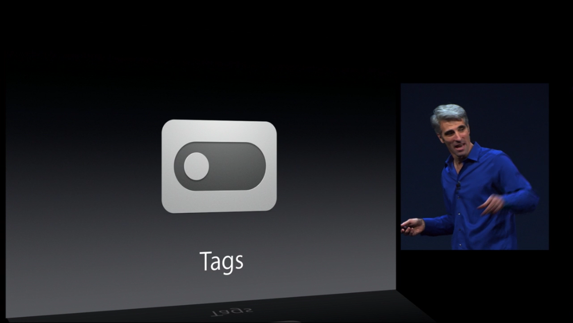 19:27: Demo-Zeit. Federighi zeigt die neuen Funktionen. Die Tags sind natürlich Farb-codiert.