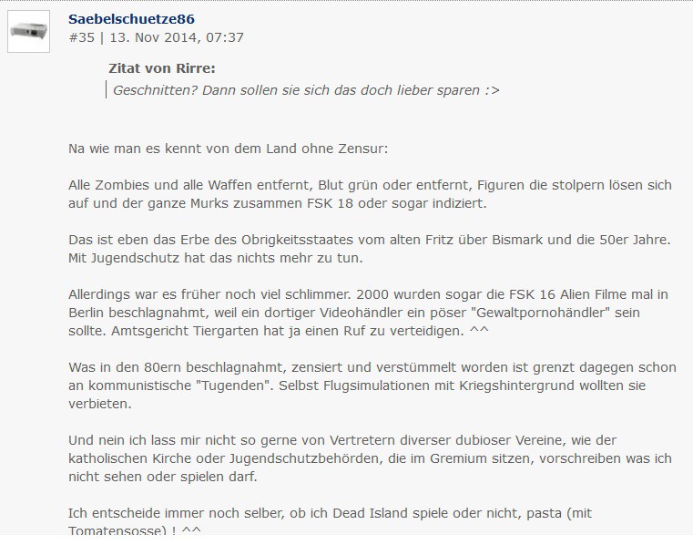 An dieser Stelle möchte ich nicht darüber diskutieren wie reflektiert der Beitrag von Saebelschuetze86 ist und ob er richtig oder falsch liegt. In einer Sache hat Saebelschuetze86 aber auf jeden fall recht: Früher wurden mehr Spiele auf den sogenannten Index gesetzt. Waren im Jahr 2006 noch 1,8% aller geprüften Spiele ein Kandidat für den Index, sind es 2013 nur noch 0,3%. Im Gegenzug ist der Anteil an Ab 18 Titeln um 5,1% auf 9,1% gewachsen. Genug der Zahlen. Differenziert betrachtet müsste man jetzt fragen, wie viele Spiele, die 2013 eine Ab 18 Freigabe bekommen haben, mussten für dieses Siegel vorher geschnitten werden?